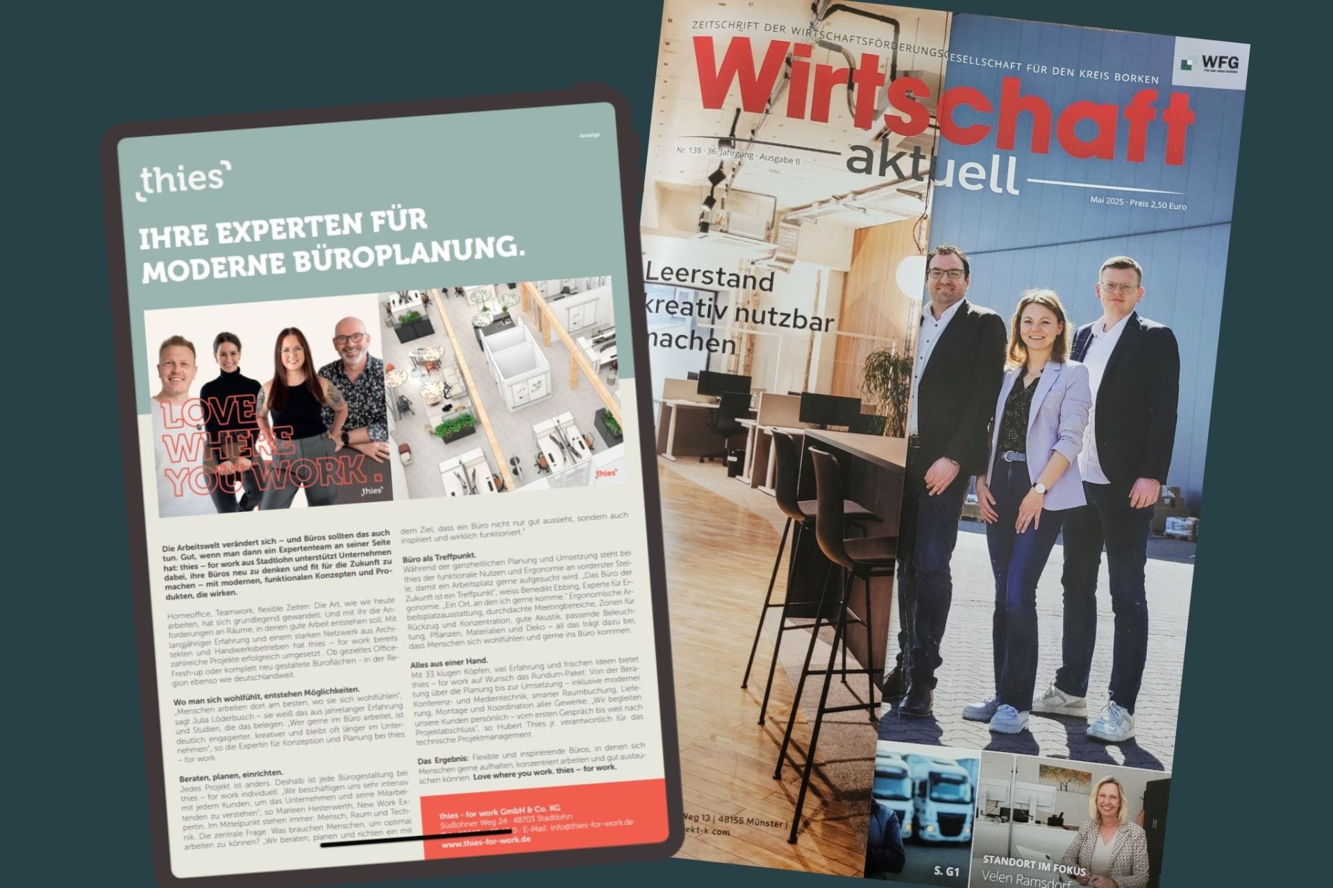 In der Wirtschaft aktuell 5/25 geht unser Expertenteam darauf ein, was moderne Büroplanung bedeutet: Räume gestalten, in denen Menschen sich wohlfühlen und produktiv arbeiten können. Die richtige Balance zwischen Atmosphäre, Funktionalität und Team-Flow macht dabei den Unterschied.