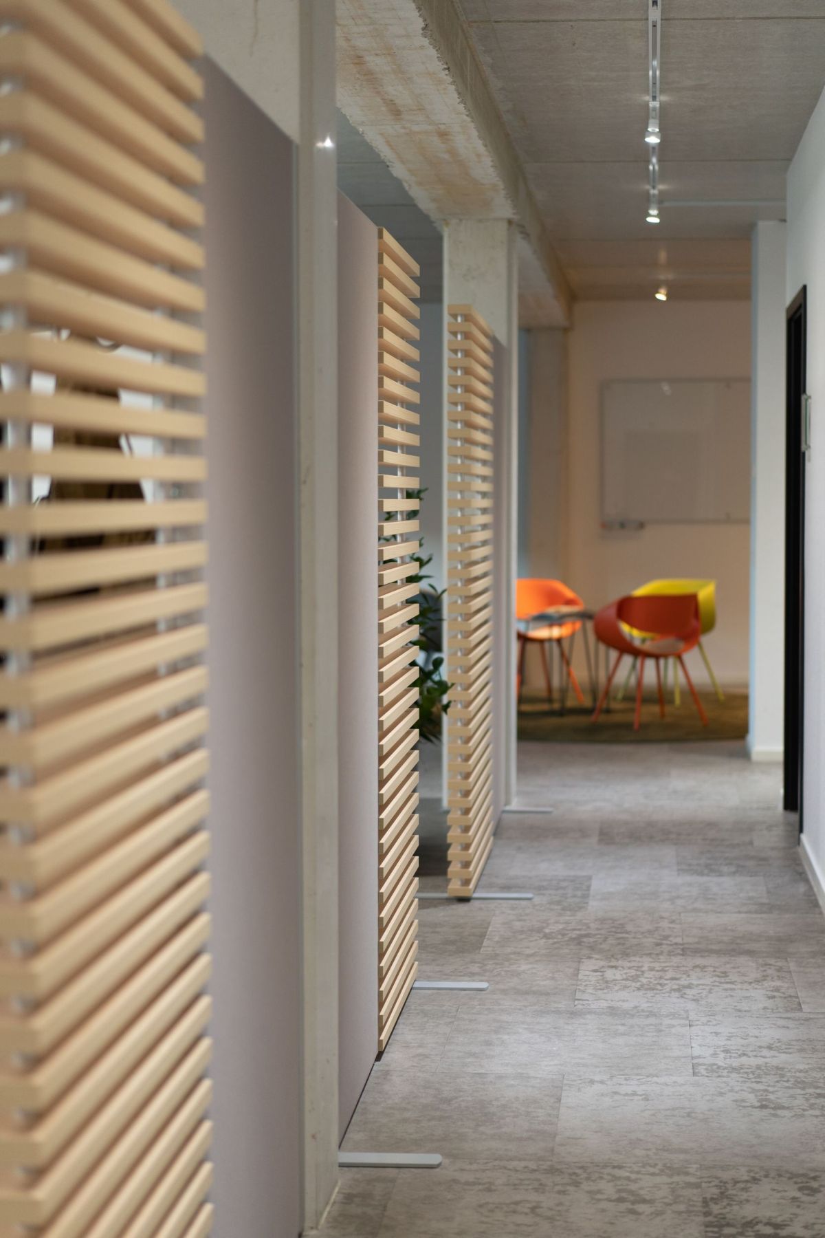 Ergonomisch geplante Arbeitsplätze mit reichlich Stauraummöglichkeiten. Ein technisch durchdachter und designorientierter Konferenz- und Schulungsbereich. Für die Kunden gibt es einen einladenden und akzentuierten Empfangsbereich. Auch für die Mitarbeiter haben wir ein gemütliches Plätzchen in der Teeküche geschaffen. Zudem kamen sinnvolle Akustiklösungen in Form von Wandabsorber und Stellwände ins Spiel. Diese bieten vielfältige und ganz individuelle Möglichkeiten, großartige Akzente zu setzen und dabei die Raumakustik schnell und effizient zu optimieren.