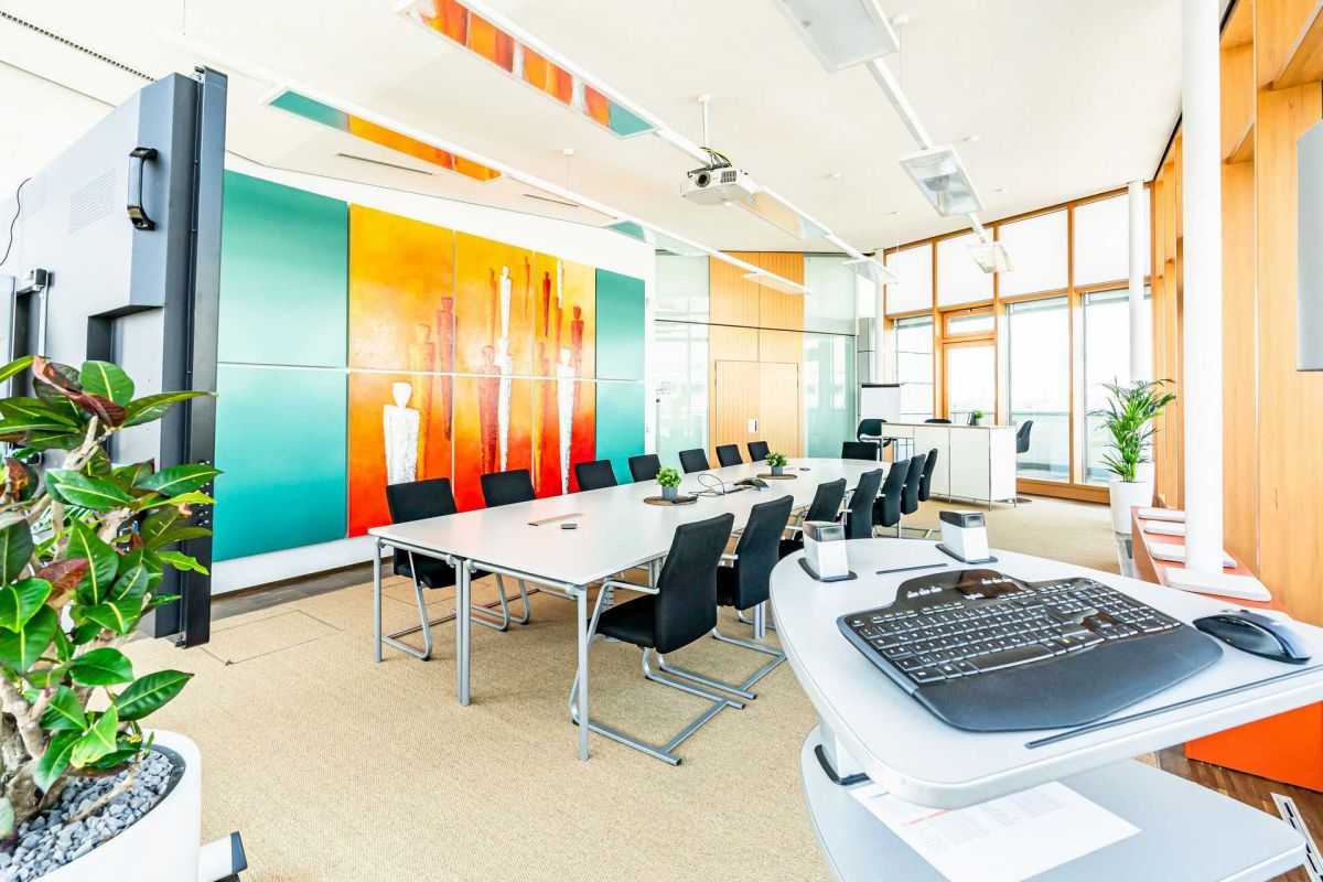Der Sitzungssaal erscheint nun auch in modernem Design und ist flexibel nutzbar. Durch die stabilen, klappbaren Tische kann das Mobiliar von einer Konferenztischlösung einfach und schnell zu einer Schulungssituation umgebaut werden. Ideal für die sich ständig ändernden Anforderungen. Eine Hochtischkombination mit integriertem Kühlschrank ergänzt den Raum und sorgt für eine unkomplizierte Catering Lösung in unmittelbarer Nähe.